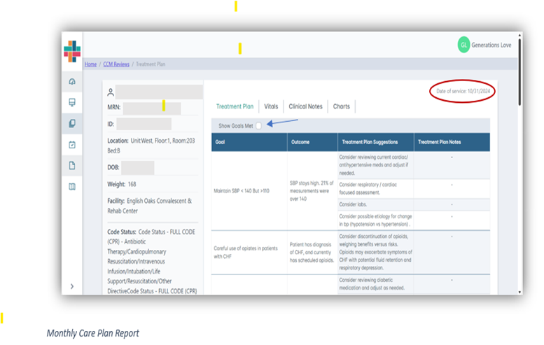 - Patient care plan will review patient demographics on the left side and care plan on the right side. The date of report is listed as date of service in top right hand side of report.