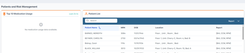 Patients and Risk Management -Top 10 High Risk Patient, Risk Stratification, Top 10 Medications Usage, or Patient List.
