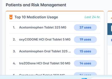 In Risk Management, users can view the top 10 medications used within the facility in the last 24hrs. This widget will refresh every 24 hours to show daily Top 10 medication usage within the facility
